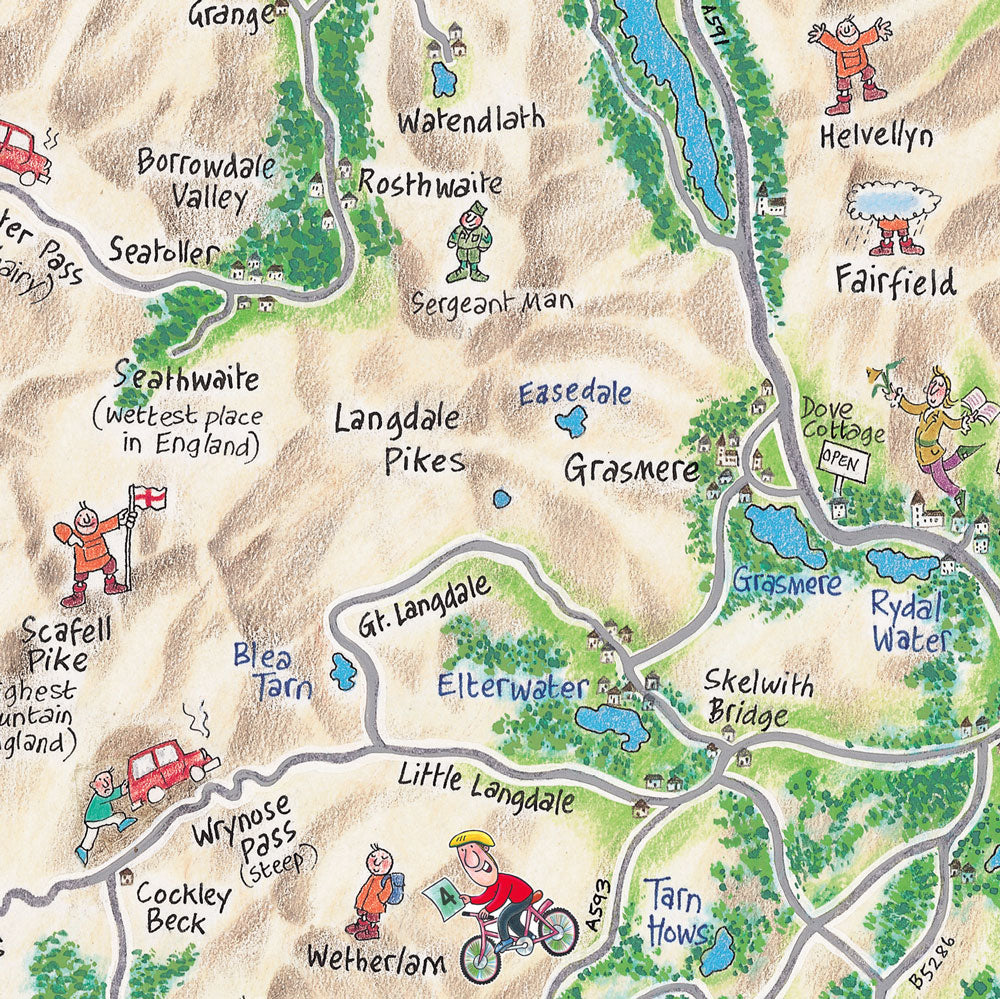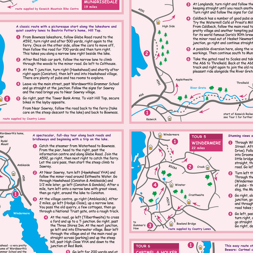 Lap Maps are designed to be easy to use with a colourful hand-drawn map of the Lake District by artist Colin Shelbourn on one side with the individual cycle route maps and descriptions as well as other useful information on the other. It folds down to fit in a jacket pocket and really enhances your visit to the Lake District.