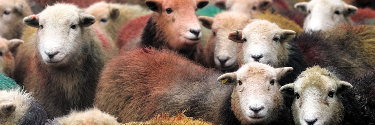 The Herdwick Gang is our name for our best-selling image of Lakeland Herdwicks. It was taken by renowned Lake District photographer Stephen Barber at Yew Tree Farm near Coniston. The sheep have just received their paint markings and are ready to return to the Lake District fells, where Herdwicks have roamed freely for centuries.