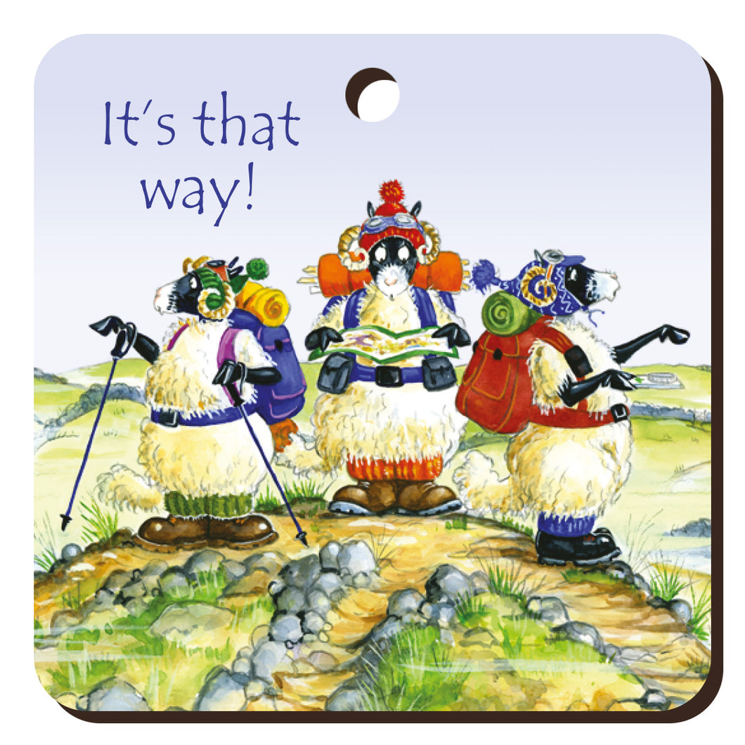 This wooden keyring is part of the Country Comials range of watercolours by artist Linda Birkinshaw. It features the "It's That Way" illustration, ideal for hikers, ramblers, walkers and particularly those with less than great map reading skills!