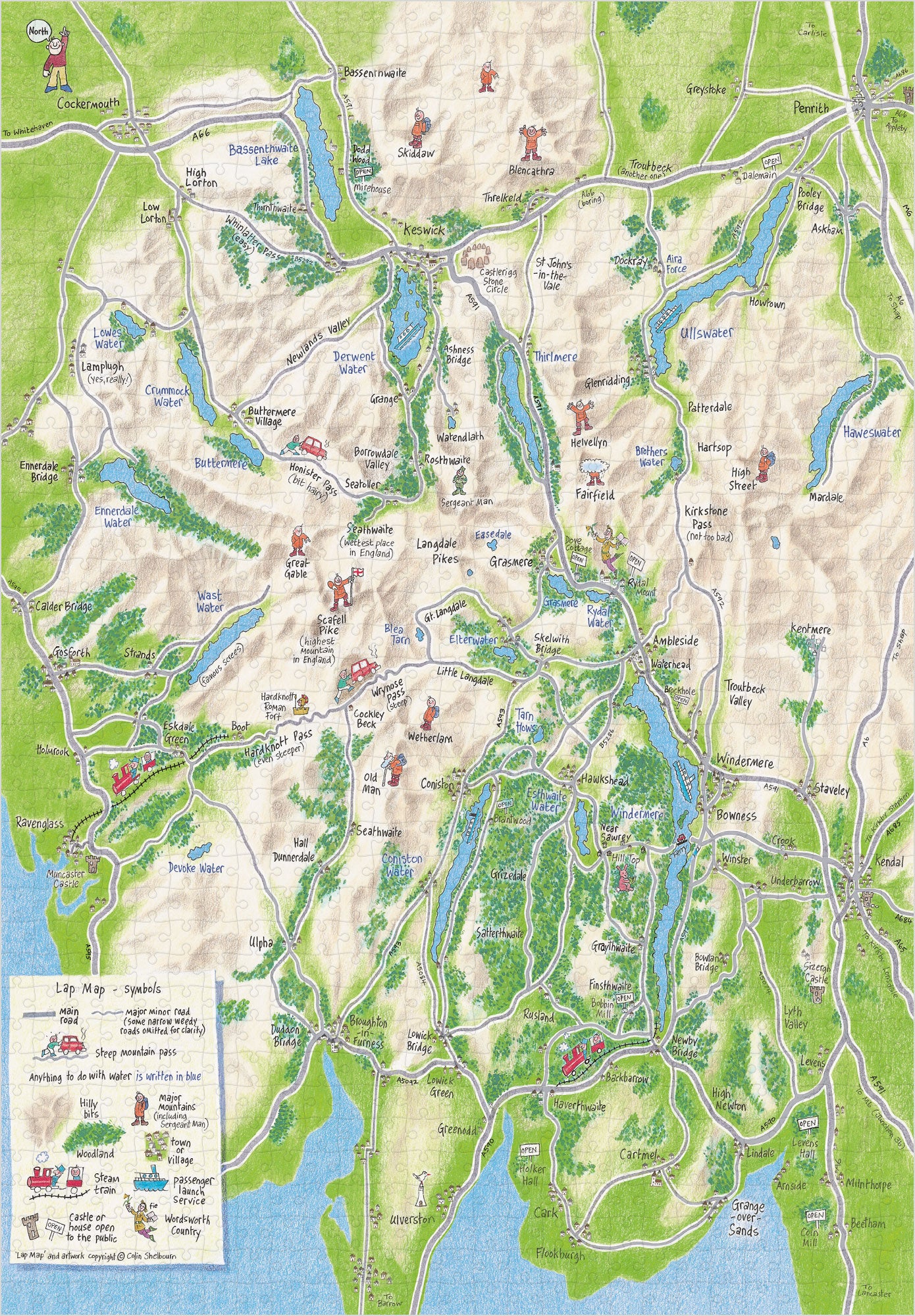 The Lake DIstrict Lap Map jigsaw artwork includes Keswick, Grasmere, Windermere, Ambleside, Ullswater, Derwent Water, Bassenthwaite, Wast Water, Ravenglass, Langdale, Coniston, Kendal, Haverthwaite, Scafell Pike, Helvellyn, Buttermere and Elterwater. A great gift for anyone who loves this incredible part of Britain.