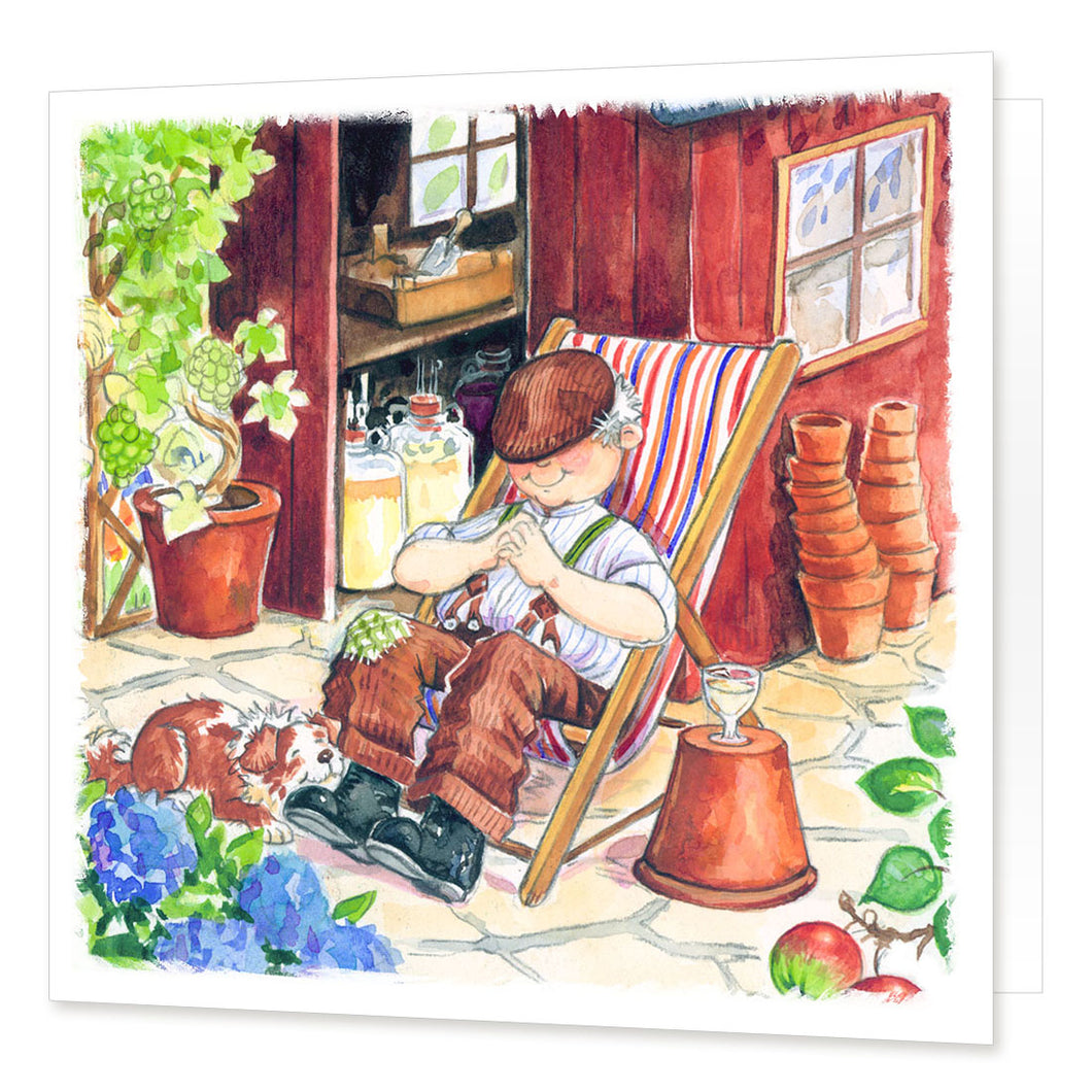 This greeting card features artwork entitled "Head Gardener" which is also available as an art print and may be available (if stock exists) as a coaster, tablemat, fridge magnet, chopping board or keyring.
