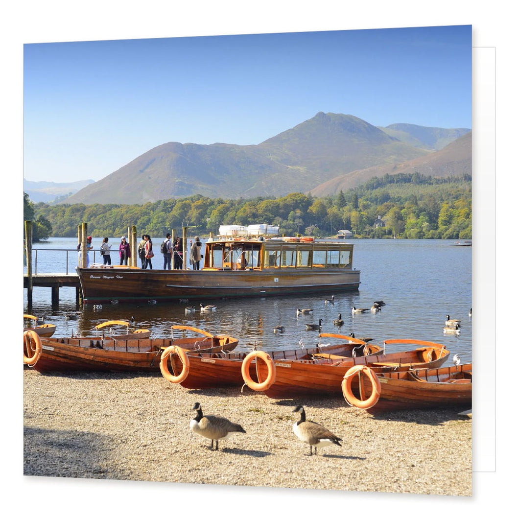 This greeting card from the Landmark Photographic range features an image of the boat landings at Keswick with Causey Pike in the background, by photographer Alex Black. Perhaps the best way to take in the spectacular views around Derwentwater is from a boat on the lake. A regular passenger launch operates on Derwent Water with several landing stages around the lake, such as Portinscale and Lodore Falls. There are also boats for hire if you wish to explore Derwent Water at your own pace.