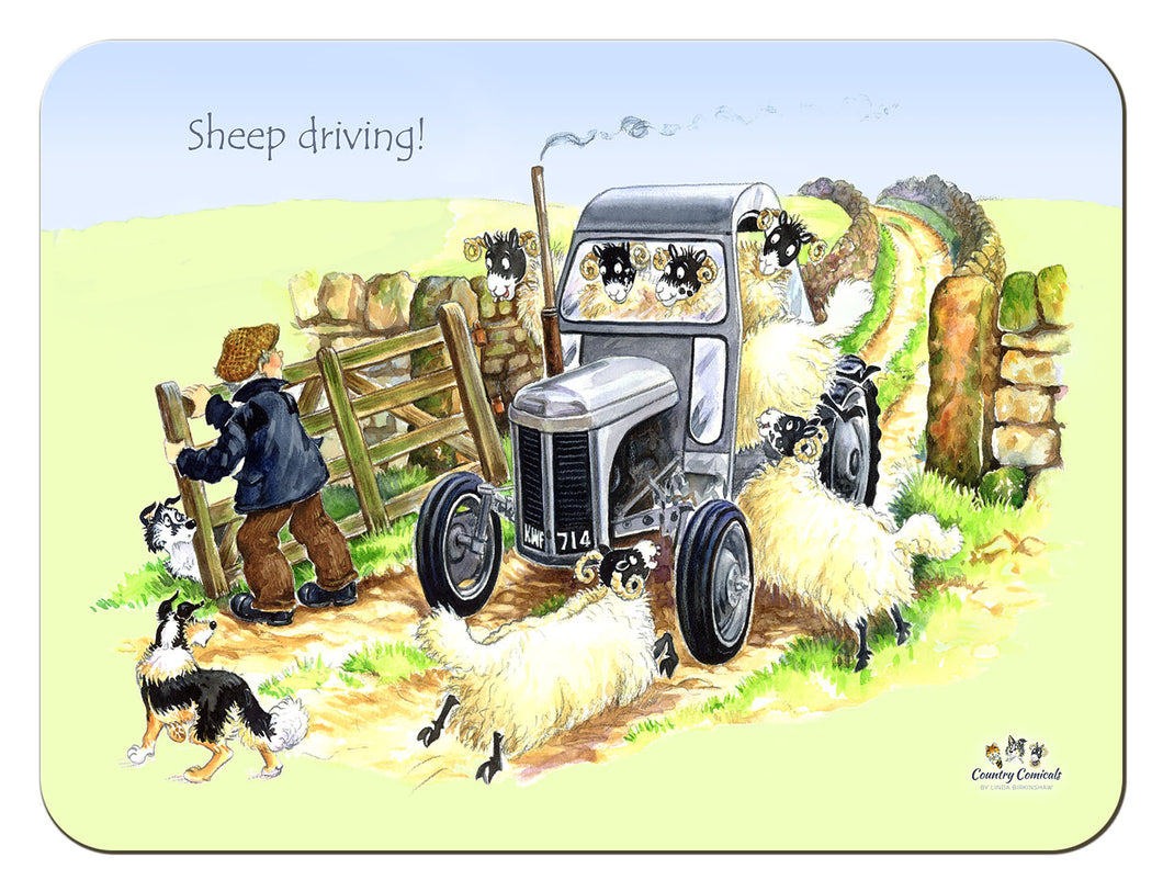 This place mat features artwork entitled "Sheep Driving" which is also available as a greetings card and art print and may be available (if stock exists) as a coaster, fridge magnet, chopping board or keyring.