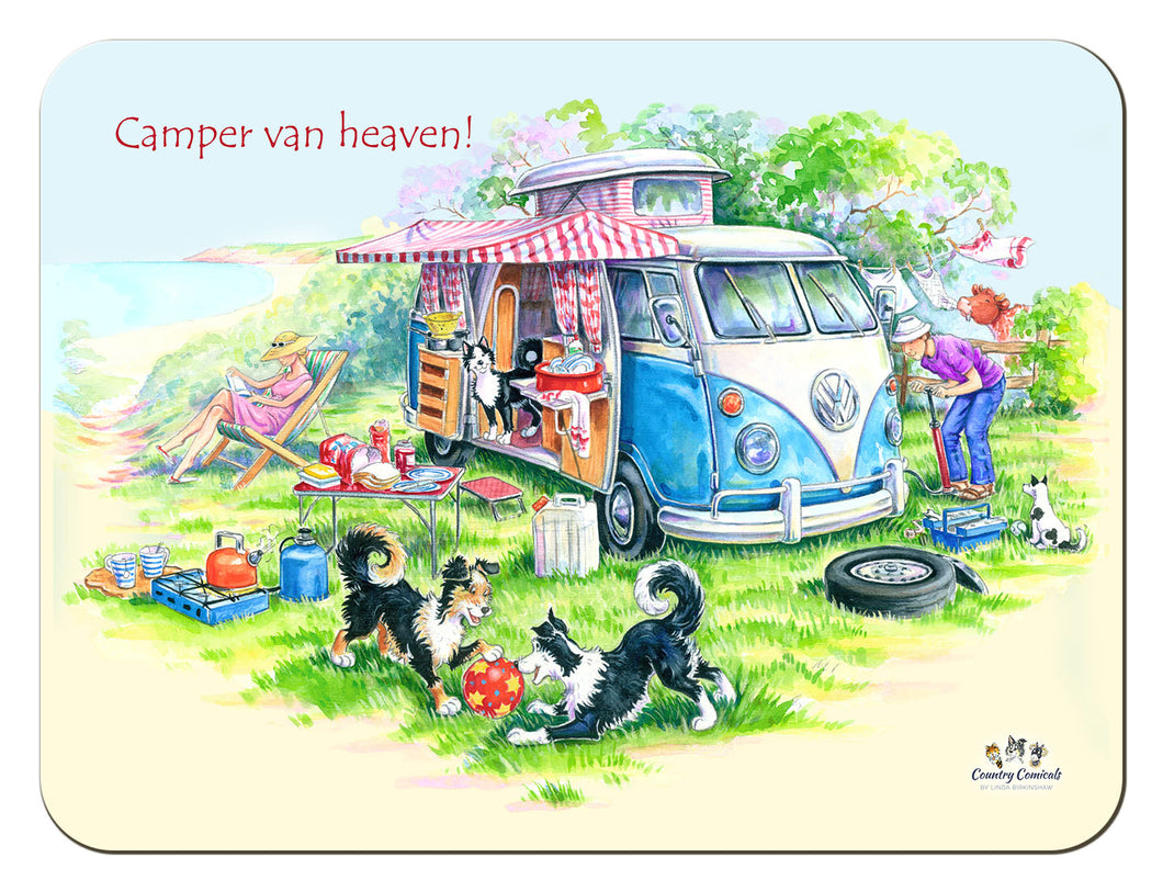 This place mat features artwork entitled "Camper Van Heaven" which is also available as a greetings card and art print and may be available (if stock exists) as a coaster, fridge magnet, chopping board or keyring.