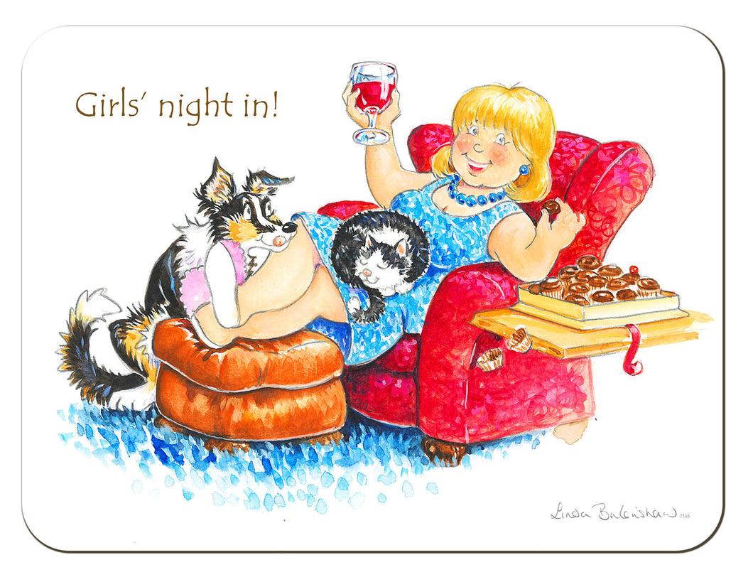 This place mat features artwork entitled "Girls' Night In" which is also available as a greetings card and art print and may be available (if stock exists) as a coaster, fridge magnet, chopping board or keyring.